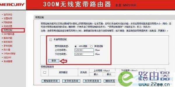 路由器限速设置一带宽限速分配宽带网络宽带的大小与用户数来决定1入户网络宽带是4M的,可以给两位用户平均分配2M宽带2入户网络宽带是8M的,可以给两位用户平均分配4M宽带,也可以给4位用户平均分配2M宽带带宽的;路由器限速的 方法 在ie的地址栏先进入路由器键入 ,用户名和密码大多数都是admin,如果不是,路由器背面有答案,进入后如图 这是点击左侧的 IP宽带控制 选项,会出现一个界面,然后注意到左下角的。