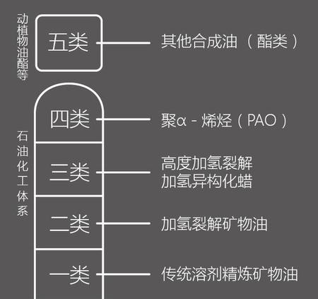 基础油分类,这个只有少数养护达人们才会去研究,基础油决定了机油品质八成以上的品质,基础油一般分为五类,1-4类为石化体系衍生物,第5类是动植物中提取出来的油酯,简称酯类。