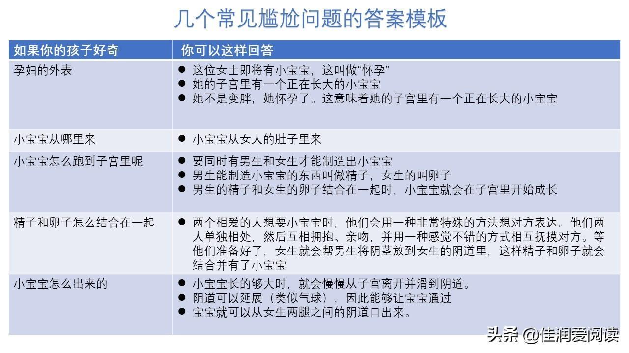 因此回答孩子性问题时应采取客观、冷静的态度,采用事实数据,以简短且直接的方式说明。既要解释科学内容,又要避免对孩子造成性刺激,激起孩子的好奇心。