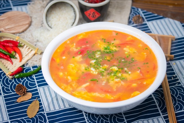 番茄蛋汤:将番茄切成小块,热锅凉油下番茄煸炒至出汁,加入适量开水烧开,打入鸡蛋液搅拌均匀,加入盐和胡椒粉调味即可。