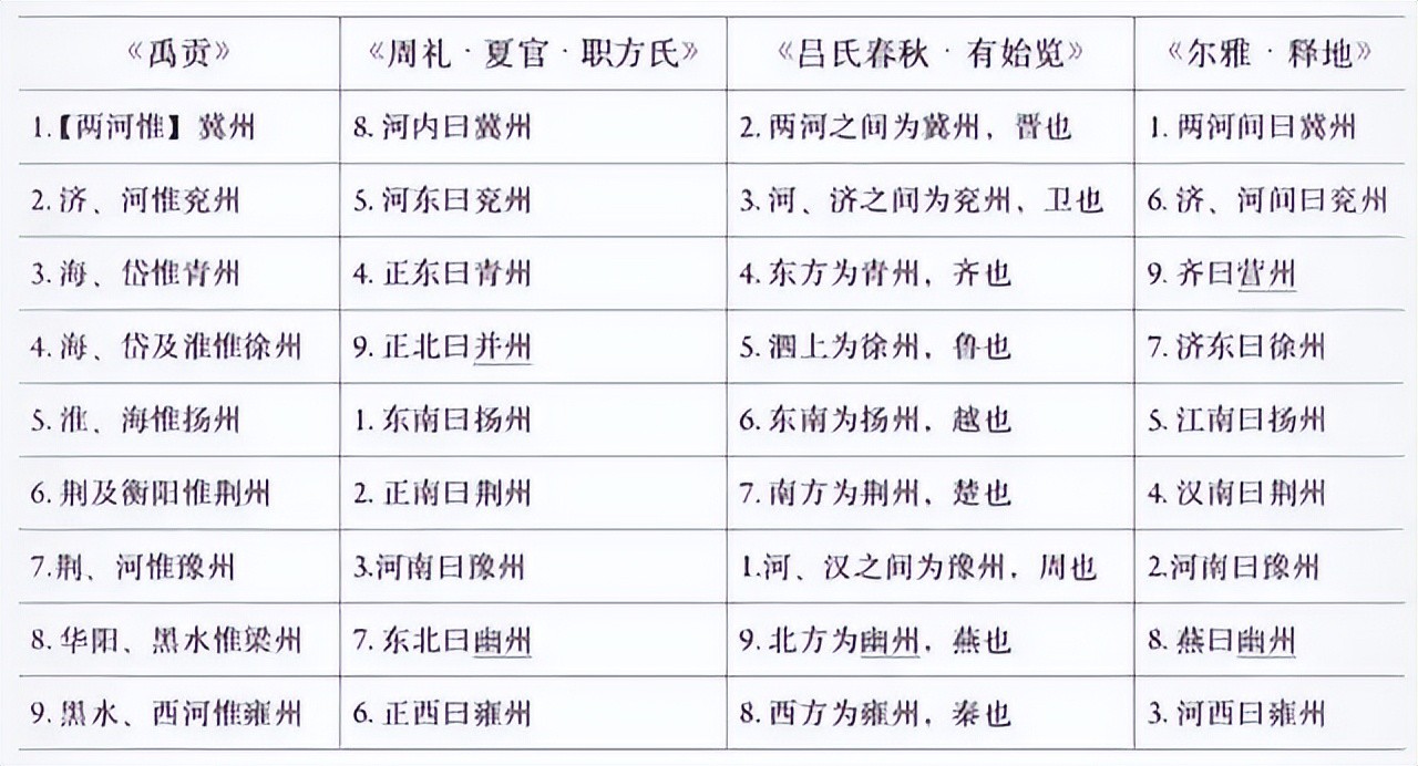 在《禹贡》里,冀州差不多包括了现在的山西全部、河北和河南的一部分,就像是春秋时晋国的中心地带;兖州在古济水和古黄河之间,现在大致是山东西部和山东河北接壤的地方;青州在渤海南边、泰山北边;徐州在淮河北边、泰山南边,大致就是现在的淮海地带;扬州在淮河和大海之间,差不多就是淮河以南,包括长江流域和岭南的一些地方。但看别的书,比如《尔雅》,九州的划分就不太一样了,青州和梁州变成了营州和幽州。这说明那时候,大家对“九州”的理解还没有一个统一的标准。