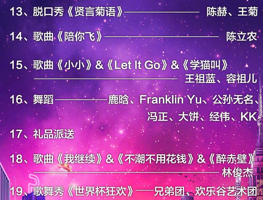 临近尾声,还有王祖蓝和容祖儿一起表演《小小》、《let it go》、《学猫叫》,最后,最最令人期待的jj林俊杰登台献唱歌曲大串烧——《我继续》、《不潮不用花钱》、《醉赤壁》。