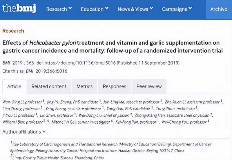 1995年,研究人员在我国胃癌死亡率最高的地区之一——山东临朐县招募了3365名志愿者作为随机对照试验(RCT)的对象,旨在评估幽门螺旋杆菌治疗、维生素补充和大蒜补充对预防胃癌的影响。