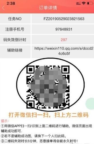 对于号商来说,他们一天要注册几千几万个微信号去卖,就需要大量的微信号来辅助,所以微信辅助注册就形成了这个利益链的其中一个环节。比如今天要说的fz辅助平台微信扫码辅助,领到任务后,扫一下码马上获得3-5元报酬,而FZ辅助平台10元即可提现秒到的。