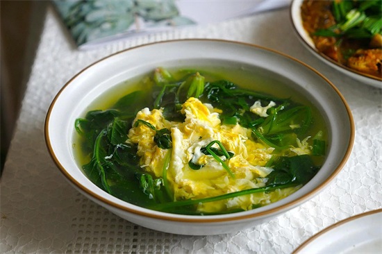 锅里添上适量的清水,放点盐鸡精味精调味,水开后淋点水淀粉勾芡,勾芡后甩上一个鸡蛋,接着把切好的菠菜末下锅,搅拌均匀,淋点香油就可以出锅了,补肝降肝火,营养又美味。