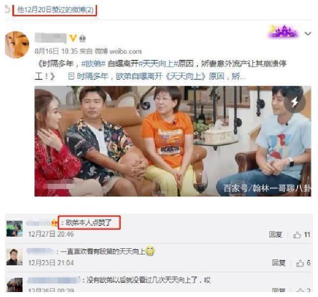 而在时隔五年之后,欧弟本人也是再次表明自己离开《天天向上》的真正原因。在12月20日,欧弟本人点赞了一篇关于自己退出《天天向上》的文章,同时这篇文章也是欧弟的一个采访回忆,文中的内容也是欧弟早期采访的真实记录。