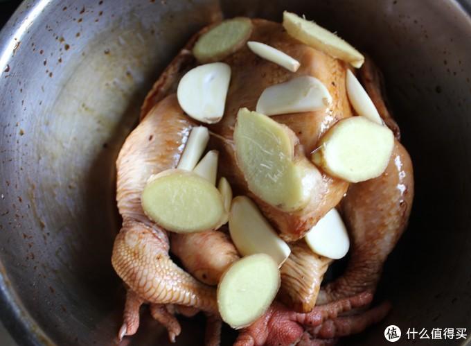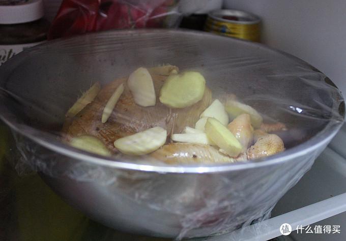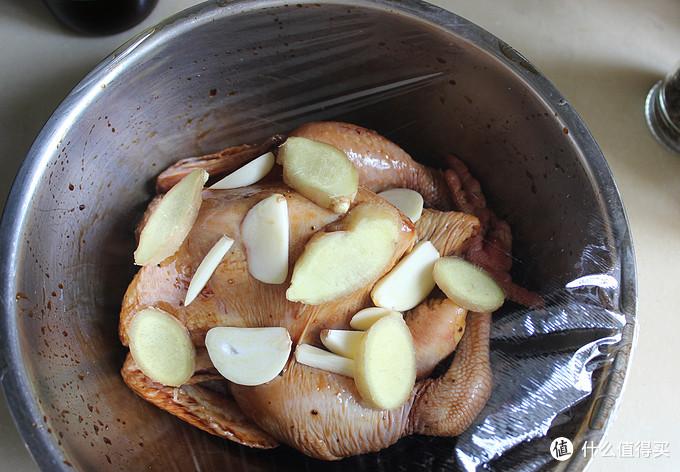按摩好的鸡放入姜片和蒜瓣再包好保鲜膜腌制