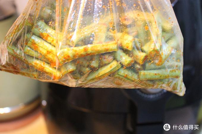 避免你们说我唠叨,我就把洗菜和切菜的步骤省略了。直接将洗净切好擦干的豆角放入保鲜袋中,加少许油,盐,烧烤料晃匀