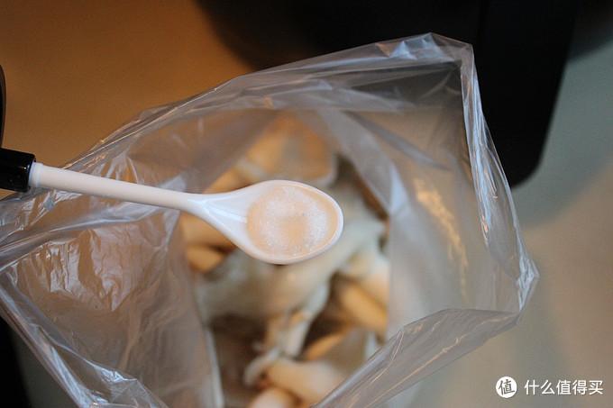 然后开始用手托着保鲜袋里的蘑菇晃动,让调料和油均匀的沾在每一片蘑菇上