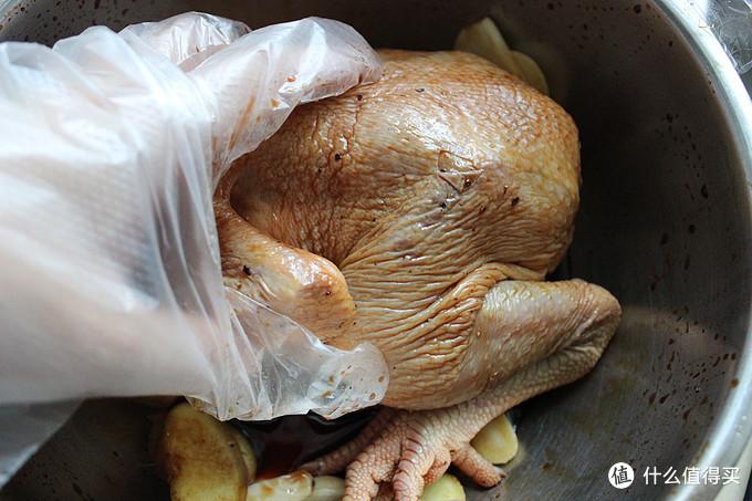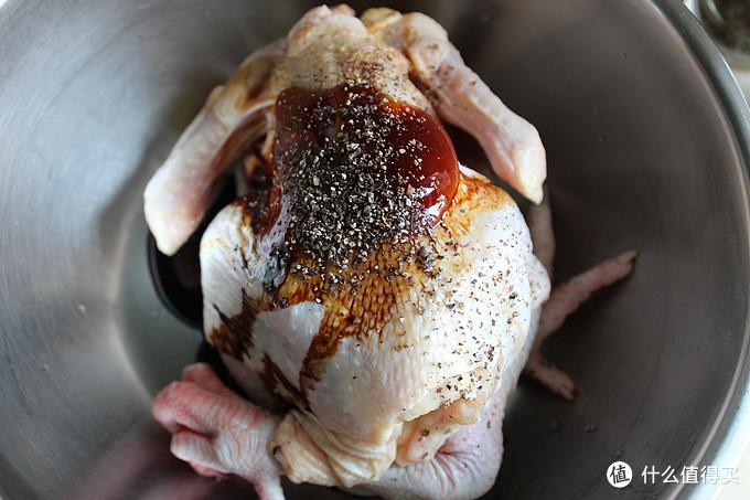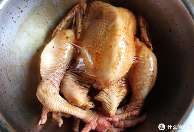 用牙签或者叉子在鸡表面扎出一些小洞帮助入味