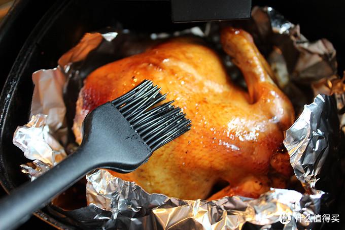 180°将鸡肉烤制10分钟后打开观察上色情况,并且在表面刷一层蜂蜜水
