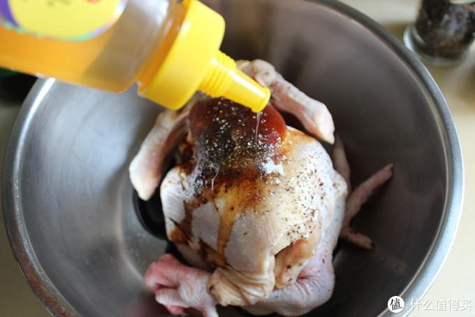准备材料:一只两斤左右的三黄鸡,姜、蒜、料酒、胡椒粉、孜然粉、生抽、生蚝、蜂蜜
