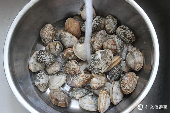 买来的花蛤放入盆中加一勺盐吐沙备用