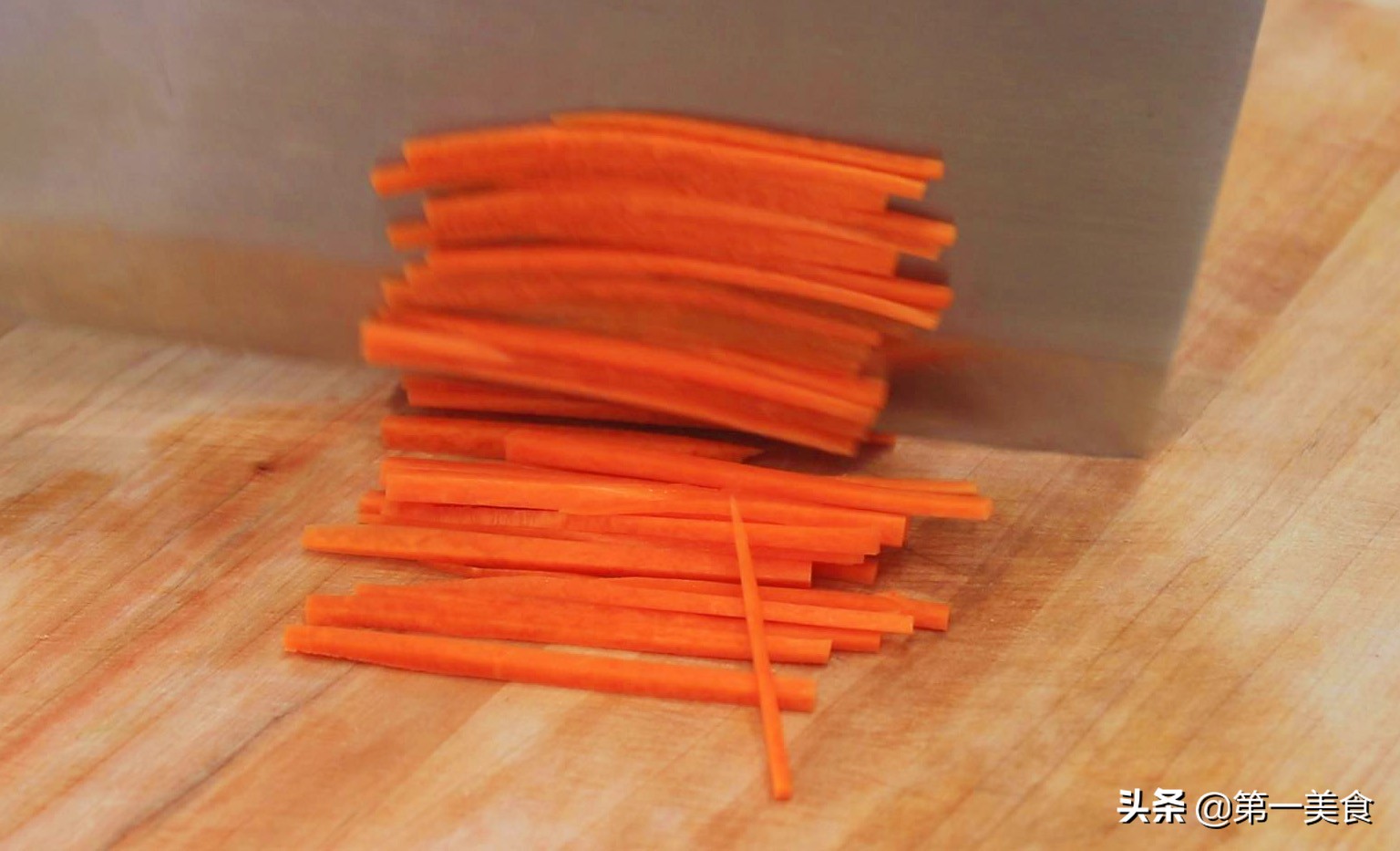 胡萝卜一小段清洗干净,先切成薄片,再改刀切成胡萝卜丝。