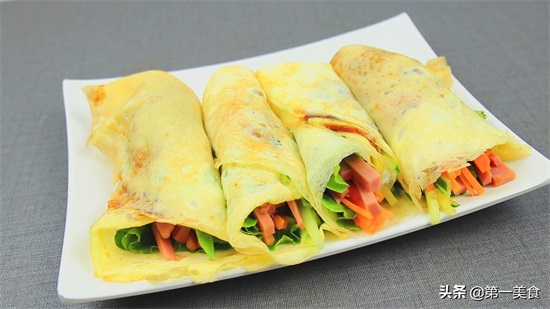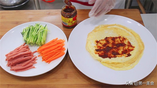 在鸡蛋饼上面抹上一层黄豆酱,放上一片生菜,然后分别放上火腿、胡萝卜和黄瓜丝,卷起来就可以食用了。