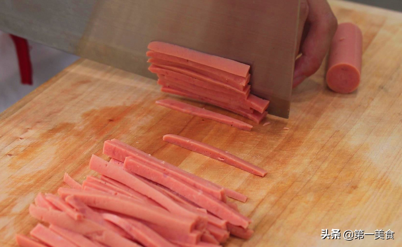 火腿肠两根切成两半,再切成细丝放在盘中。