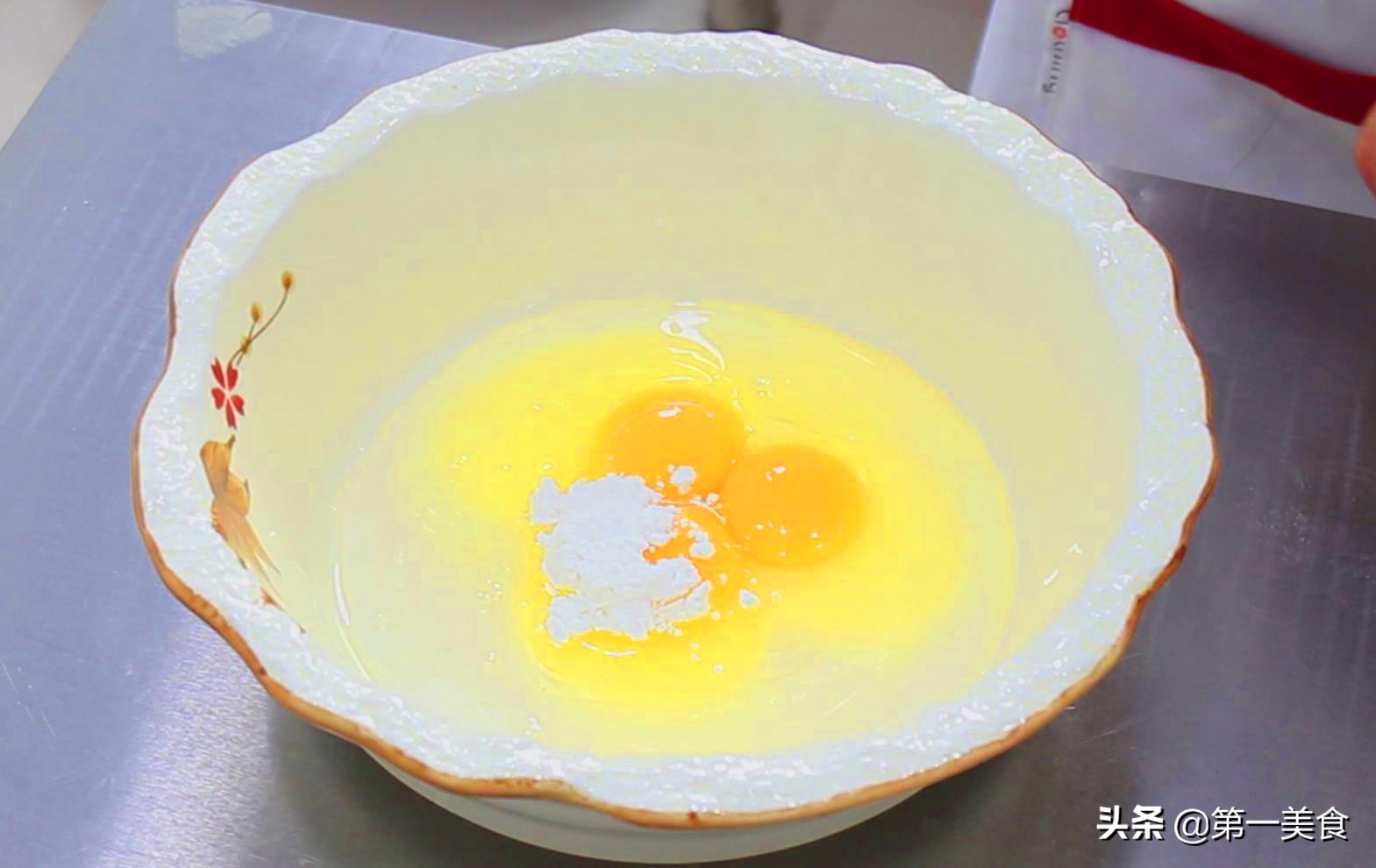 首先我们准备一下食材,准备一个小盆,打入三个鸡蛋,倒入一点清水,然后倒入植物油3克,加入玉米淀粉10克,用筷子搅拌均匀。