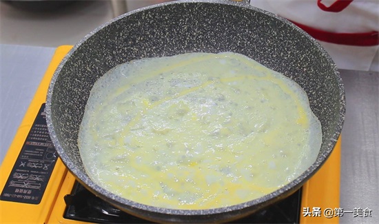 我们把鸡蛋饼煎出来,不沾锅烧热以后,不用抹油,要开小火,直接倒入一勺鸡蛋液,轻轻晃动不沾锅把鸡蛋液摊匀。
