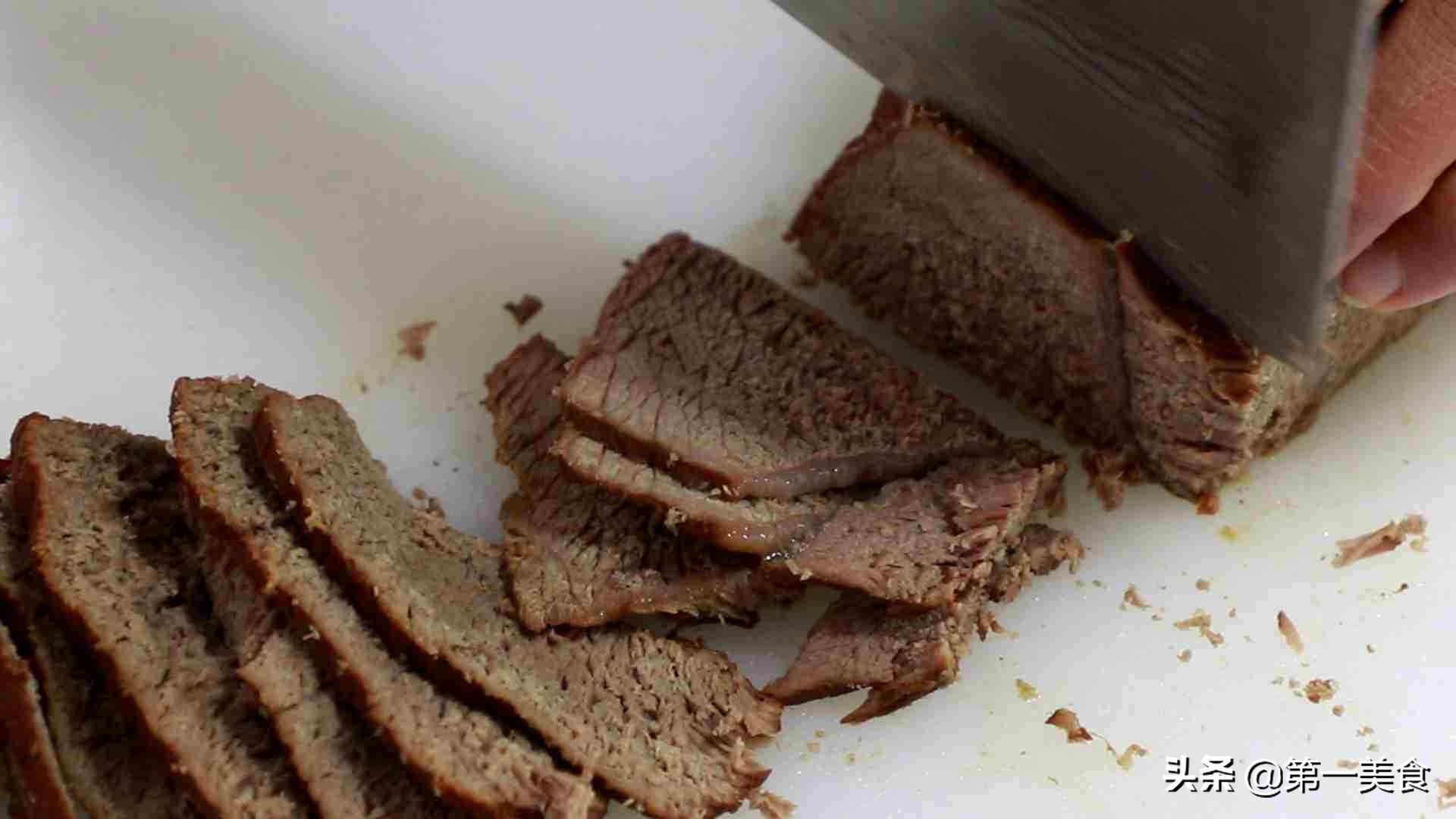 5.1个小时以后,牛肉已经煮熟,能用筷子轻轻穿透,把牛肉取出,稍微晾凉,顶着牛肉的纹理,切成均匀薄片。顶着纹理能把牛肉的筋切断方便食用。