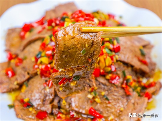 然后把切好的牛肉摆放在盘中,浇上调好的料汁即可上桌。