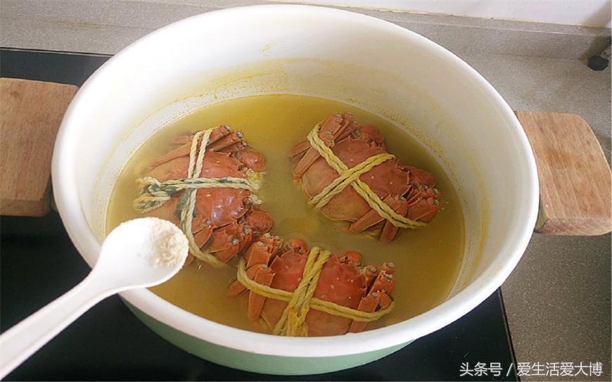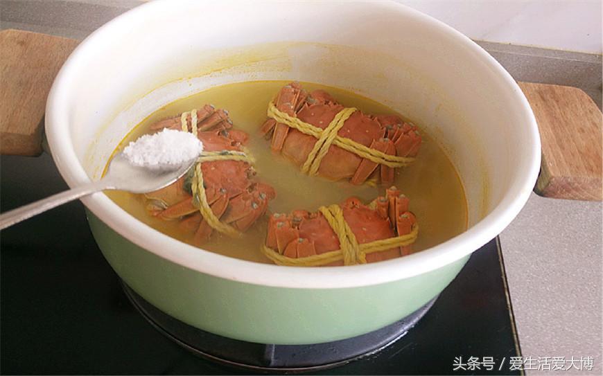 第五步:将大闸蟹煮大约5分钟,加入食盐调味。