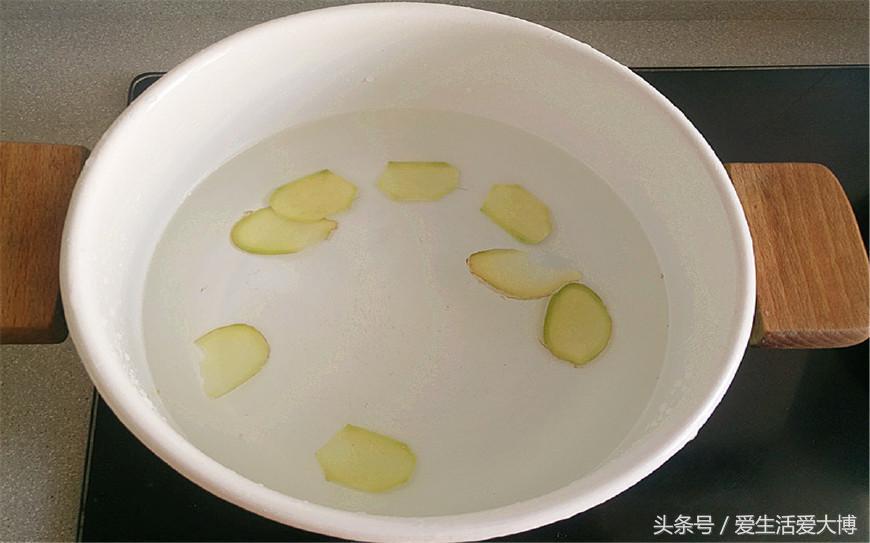 第三步:锅中倒入适量水,加入生姜片将水煮开。