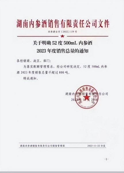 11月22日,湖南内参酒销售有限责任公司发布《关于明确52度500mL内参酒2023年度销售总量的通知》,为落实配额管理要求,经公司研究决定,52度500mL内参酒2023年度销售总量不超过800吨。