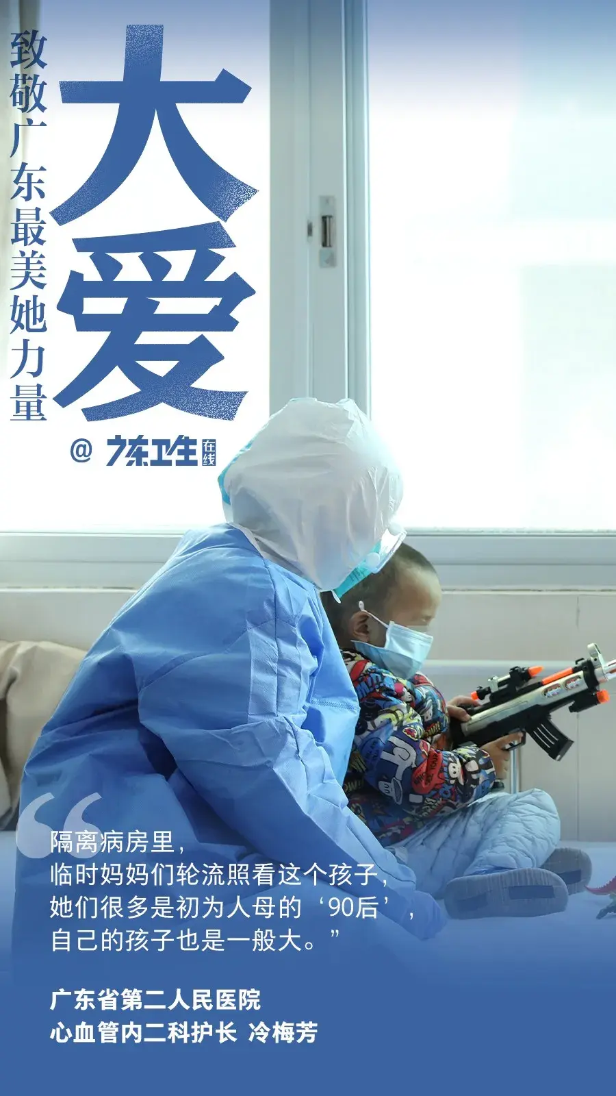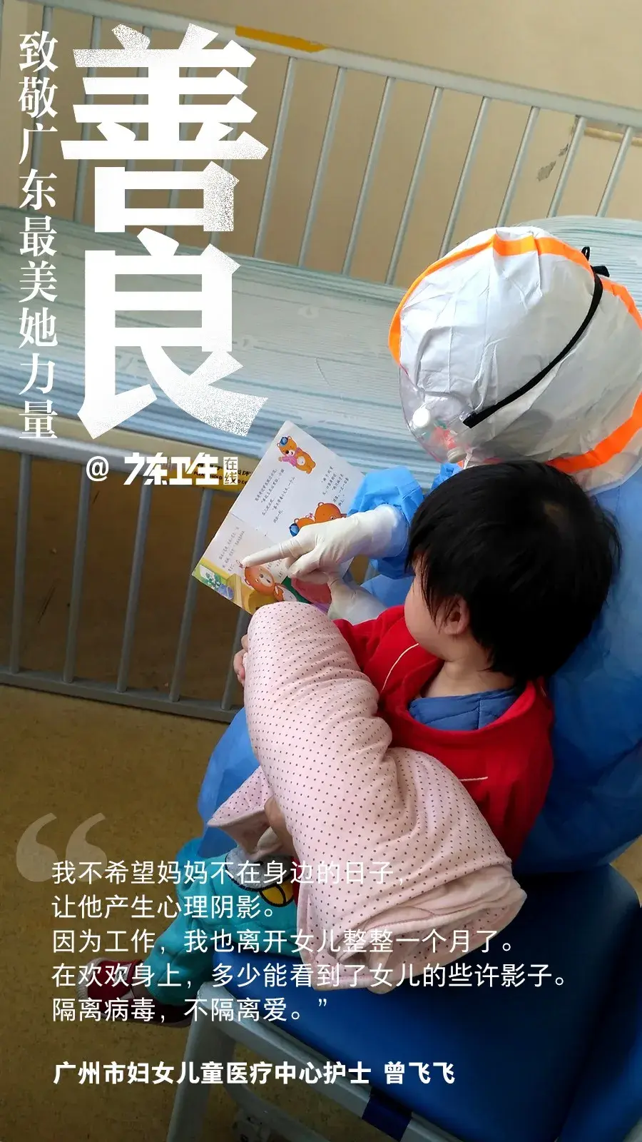 一家6口,5个人相继确诊新冠肺炎进了隔离病房,剩下家里2岁半的孩子在外面,还发烧了,谁来照顾?不到半小时,广东省第二人民医院28名护士报名轮流照顾这个孩子。