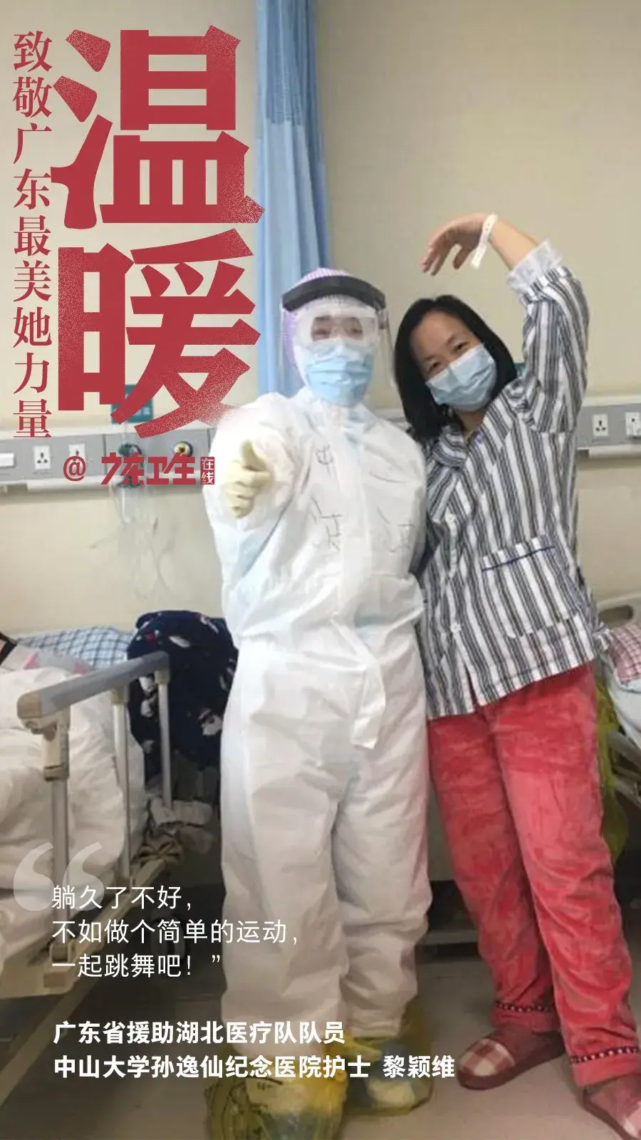 看到窗外阳光明媚,在武汉方舱医院治疗的“三姐妹”却不能迈出病房,情绪低落。黎颖维和队员巡房时看到后,灵机一动,动员她们一起运动。队员们火速选好音乐,与三位患者一起跳舞,久违的音乐和身体的律动让她们重展笑颜。