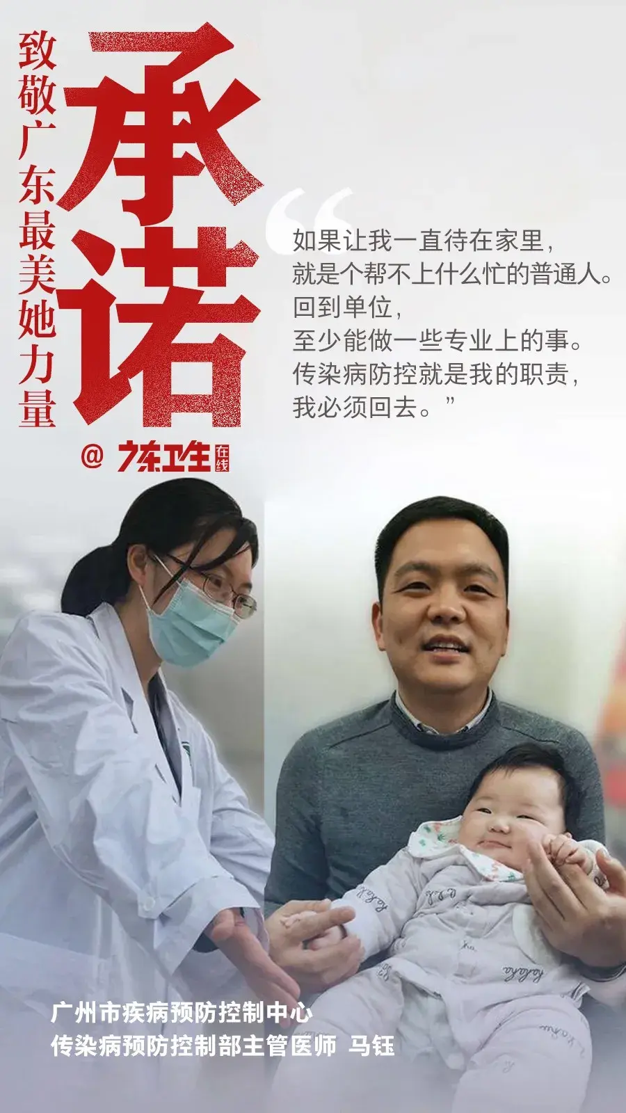 疫情发生之时,产假中的马钰和宝宝正在湖南岳阳老家。随着疫情发展态势逐渐严峻,她再也坐不住。放弃产假、狠心断奶。大年初二一早,4个月大宝宝还没起床,马钰和丈夫自驾车回了广州,加入到单位的疫情监测组,这是防控任务最重、工作最苦、风险最大的工作组之一。