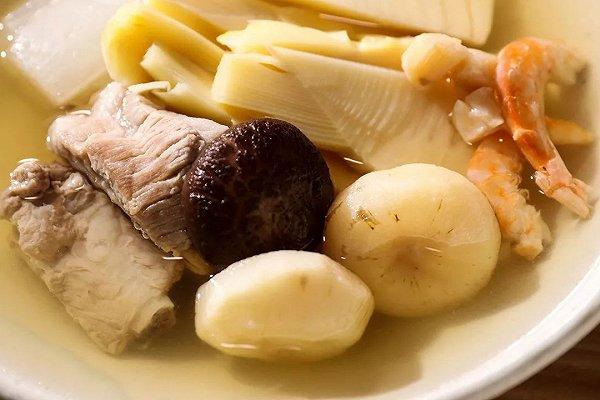 5. 将冬笋、鱼肉丸、咸鸡腿及冬笋放入