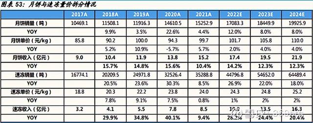 1)对月饼、速冻进行量价拆分,假设月饼产能利用率和产销率均为100%,考虑月饼增速一直以来相对平稳,2021年因疫情影响增速减缓,预计2022年增速有所回升,假设月饼2022-2024年月饼销量增速达12.0%/8.0%/8.0%,单价增速达2.0%/4.0%/4.0%,则营收增速为14.2%/12.3%/12.3%(22年上半年月饼增速为21.68%,超预期),毛利率为56.6%/57.0%/57.2%。