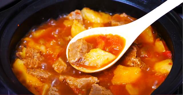 8、牛肉炖好之后 把里面的葱姜大料给捞出来 然后再放入土豆块,放入切好的西红柿块,继续小火炖。然后再添加盐 生抽 老抽 鸡精 胡椒粉调味 最后再放入一块腐乳 继续炖10分钟左右