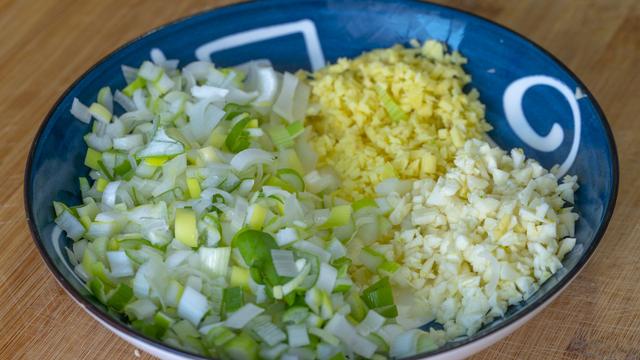 8、全部打好后再来切点葱姜蒜,大葱切葱花,生姜切碎,大蒜也切成末。