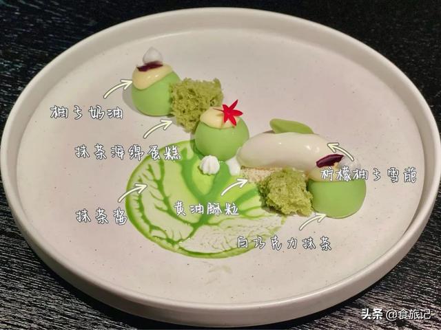但配着微苦的抹茶酱、低甜度低的抹茶海绵蛋糕,再加上清新酸度的柚子奶油和柠檬柚子雪葩,风味融合在一起就刚刚好。