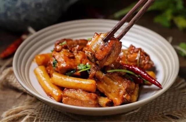 排骨年糕是上海地区的一种风味小吃,主料是大排和年糕,经过烧制排骨肥嫩香鲜,年糕软糯解腻又有排骨的香味,烧制的时候还会加入甜面酱和辣椒酱两种酱料,吃起来甜辣适中,十分可口。
