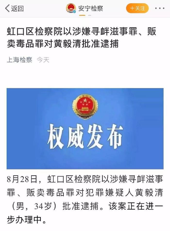 8月28日,虹口区检察院以涉嫌寻衅滋事罪,贩卖毒品罪对犯罪嫌疑人黄毅清批准逮捕。
