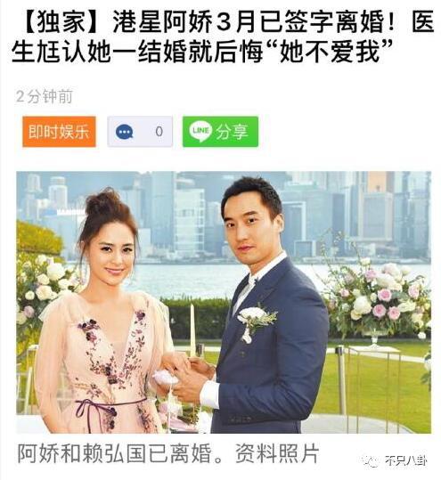 据港媒报道,2018年婚后不久阿娇就提出想要离婚,但是被赖弘国挽回了;今年2月,阿娇又提出离婚,结果俩人3月就真离了。