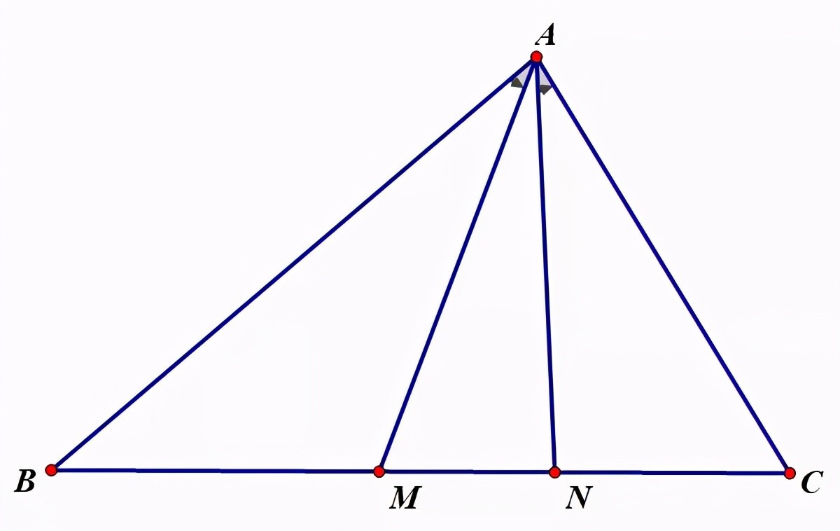 如图,在ΔABC中,M、N是BC边上不同的两点,使得直线AM和AN关于∠BAC内角平分线对称,