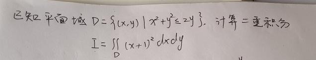 解题思路:积分区域D关于y轴左右对称,被积函数(x+1)^2=x^2+2x+1,其中2x是x的奇函数,x^2+1是x的偶函数,先利用奇,偶性化简,然后再用极坐标计算。