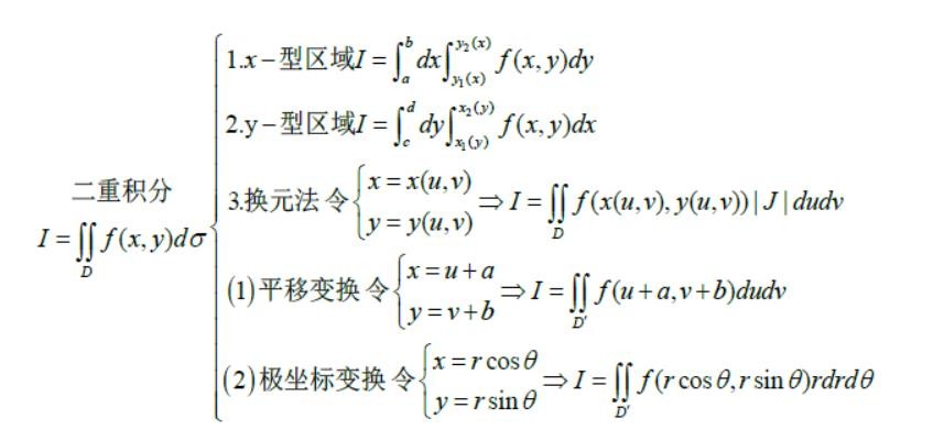 在考研中,对于二重积分重点要掌握二重积分的计算方法(直角坐标,极坐标),二重积分计算公式如下: