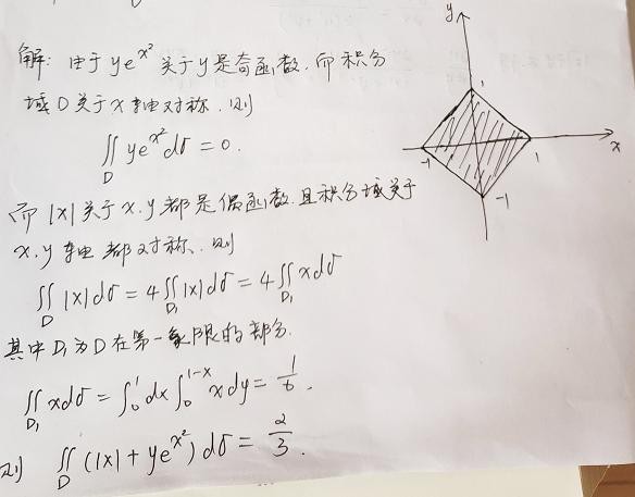 解题思路:先画积分域D,不难看出该积分域关于两个坐标轴都对称,被积函数也有奇偶性,因此,应利用对称性和奇偶性。