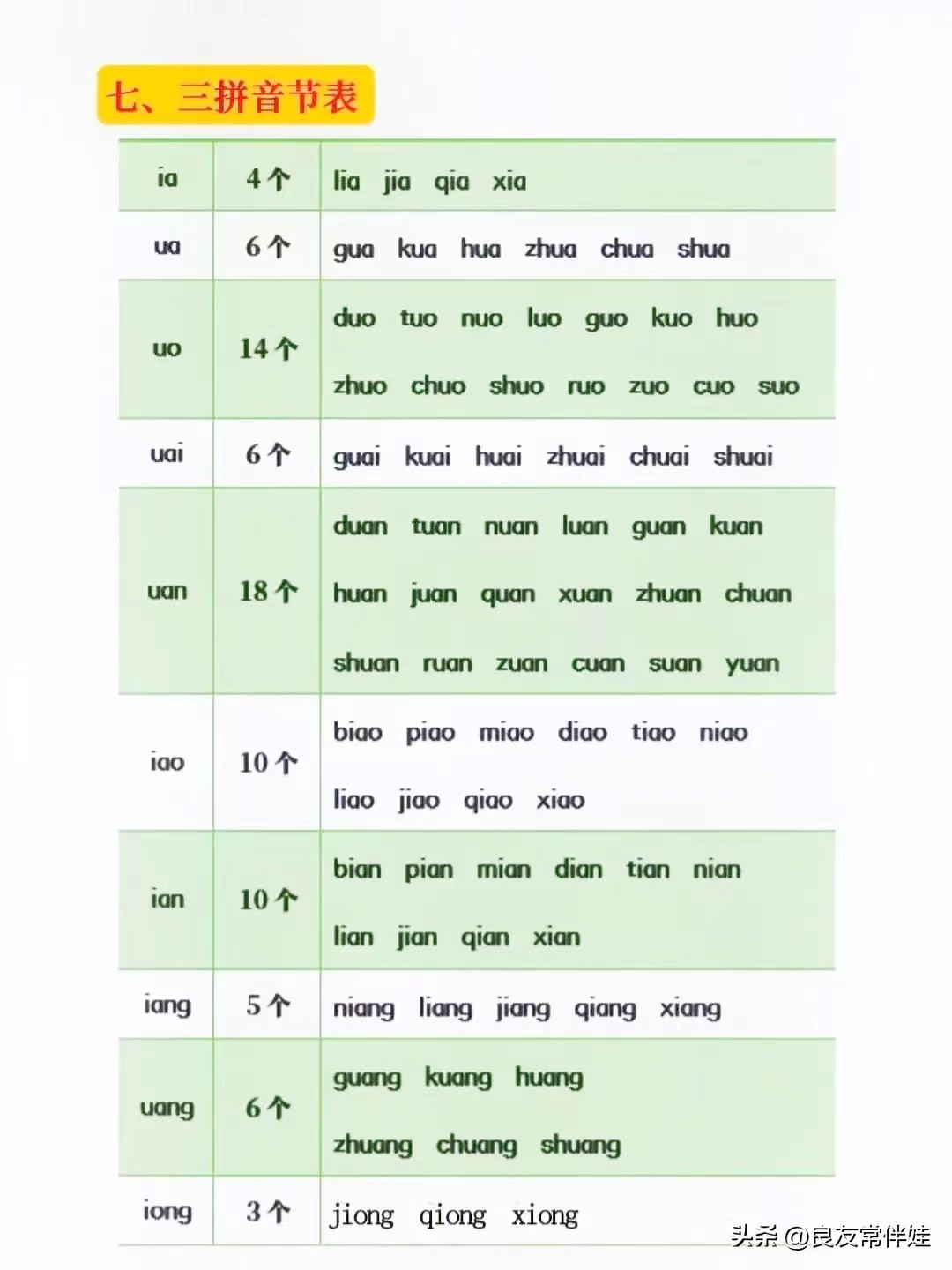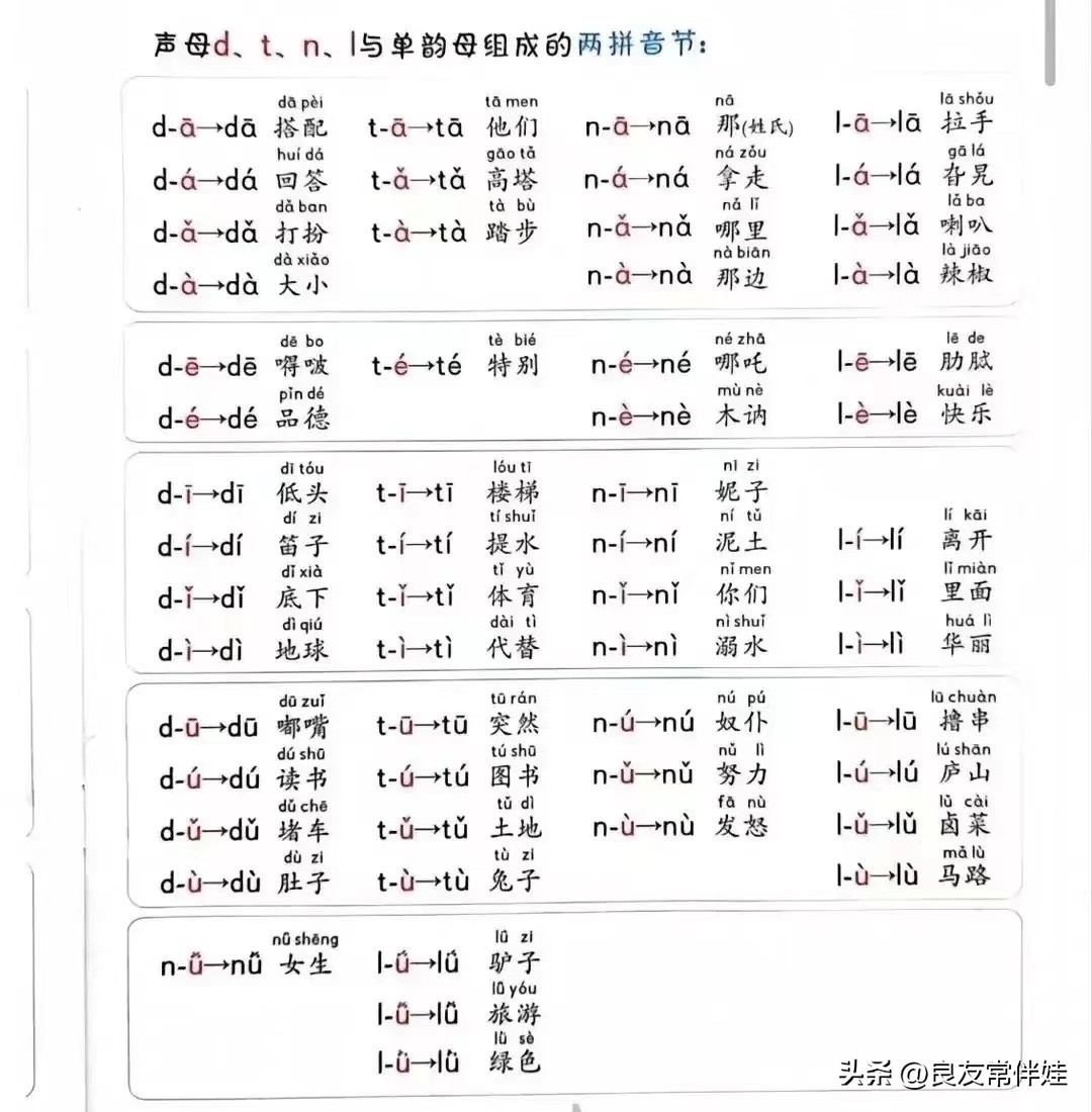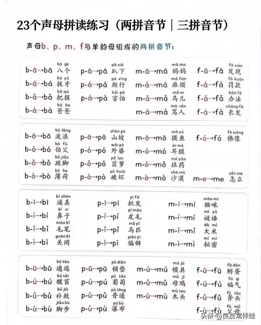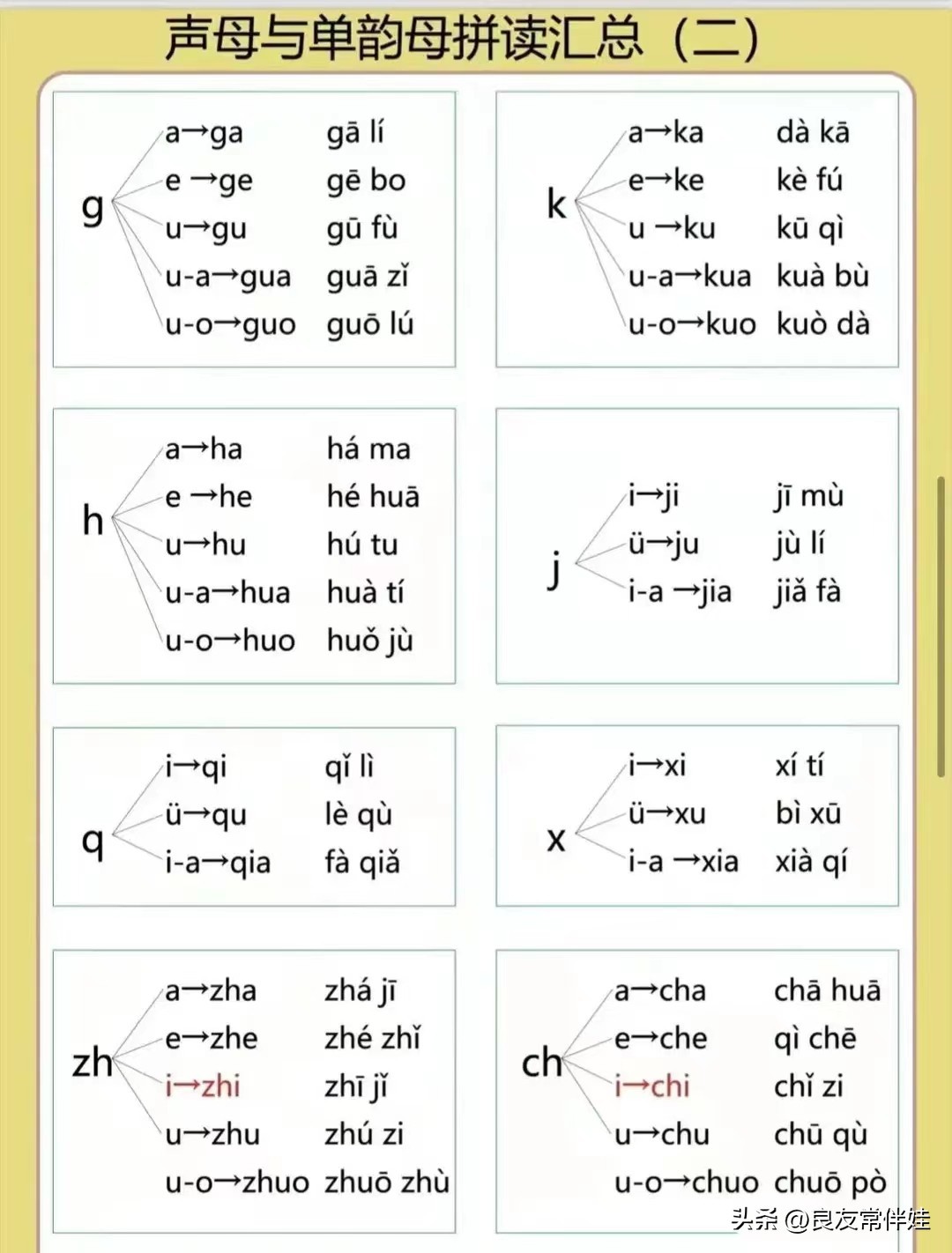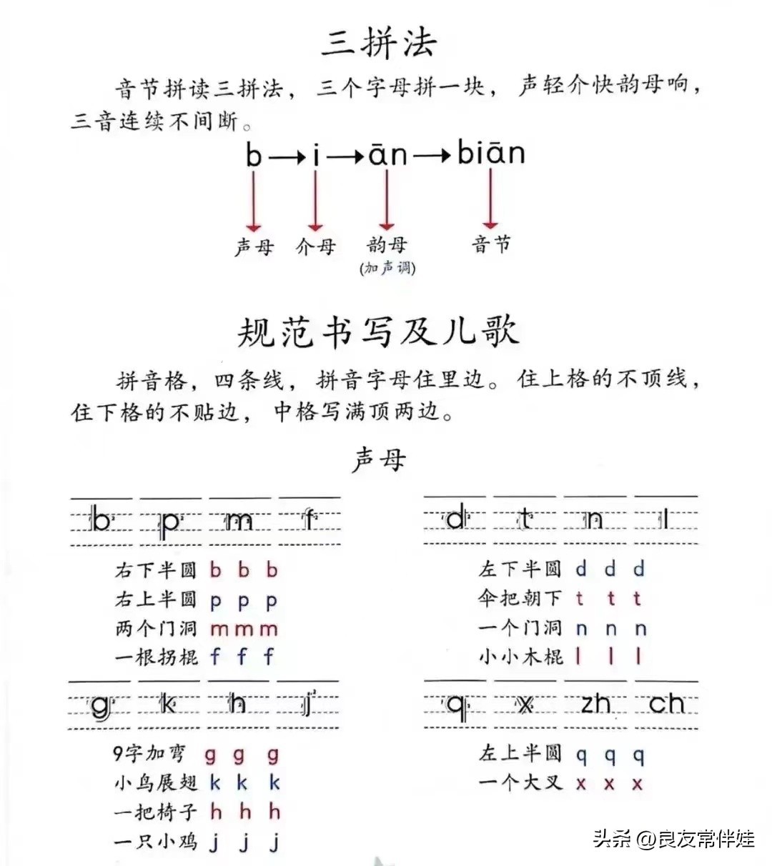 很多孩子在进入一年级后会发现单个拼音字母都会读,但是把声母和带声调的韵母组合在一起却很难拼读成一个字(音),这是为什么呢?我们都知道,要学好拼音,一些基础的知识是必须掌握的。首先,音节是拼音的基本单位,而音节是由声母、韵母、声调组成。接着,要知道拼读(二拼三拼音节)的规则,标调(相应字母位置)规则及特殊音节(整体音节)。然后,要清楚知道拼写规则(变声、轻声)与规范。最后,一定要区分清楚相似声母韵母(b\d\p\q\ui-iu\ei-ie)读音与拼写,不能混淆。只有熟练掌握这些基础,那么学拼音拼读拼写就会容易很多了。建议家长收藏好,不然想用的时候再也找不到了,实实在在的干货,快打印给孩子多练练吧!