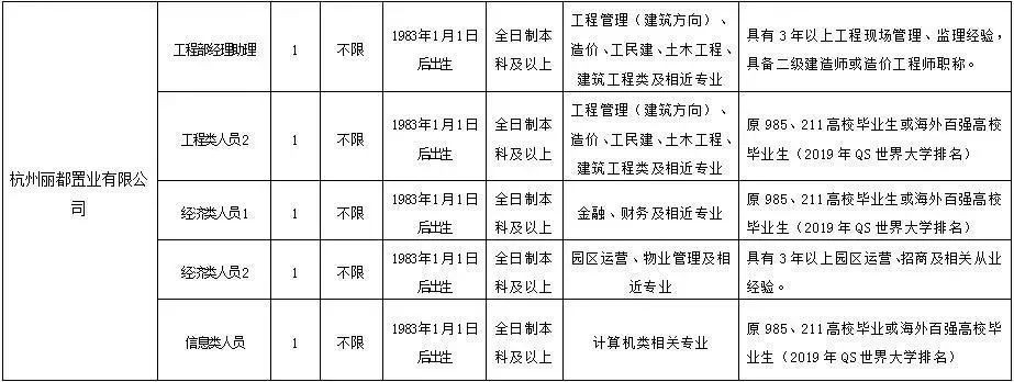 杭州余杭金融控股集团计划面向社会公开招聘集团本级员工1名,下属全资子公司杭州余杭政策性融资担保公司招聘员工5名,杭州丽都置业有限公司招聘员工5名。