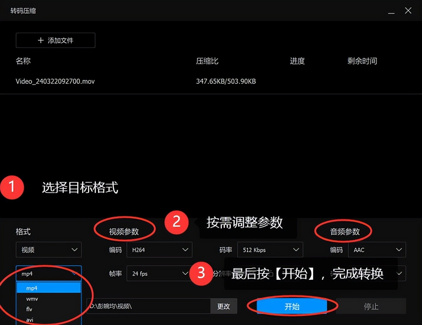 步骤三:在弹出的转码界面中,选择输出格式、输出路径、视频参数等。根据您的需求,选择合适的输出格式和参数。