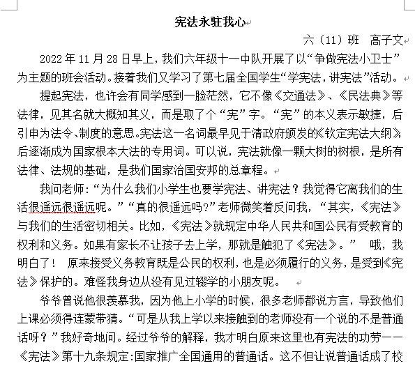今年的12月4日是我国第9个国家宪法日,为学习贯彻党的二十大精神,掀起学习宣传宪法的热潮,大力弘扬法治精神,淮安市天津路小学大队部开展了线上宪法宣传周活动。