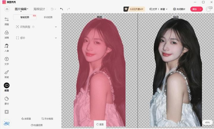 主打抠图功能的修图软件,采用先进的图像识别技术和人工智能算法,可以自动识别并分割目标区域并处理复杂和不规则的形状目标,从而快速、准确地对人像或物品等多种类型进行抠图操作。