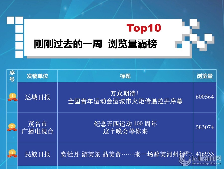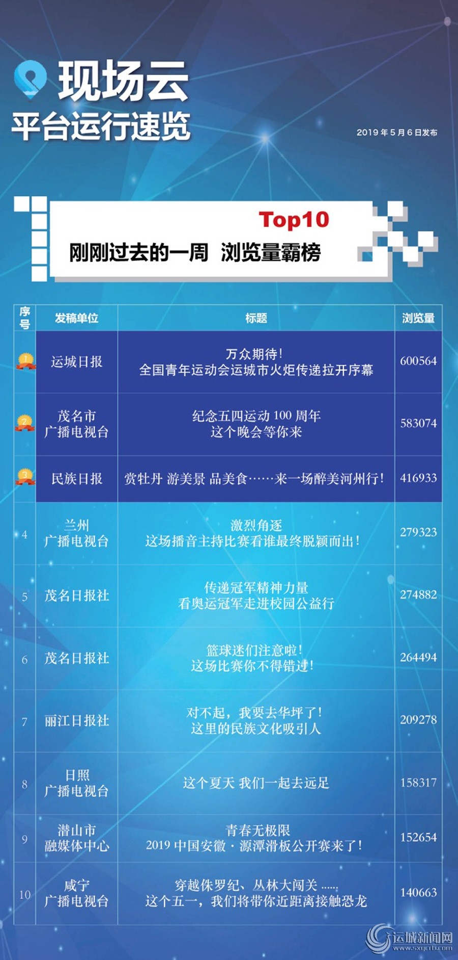 本报讯(记者 陈雁冰)传递青春之火,点燃时代激情。5月4日,第二届全国青年运动会实体火炬传递在芮城县拉开序幕。运城日报客户端“运城新闻”全程直播我市火炬传递活动盛况,在刚刚过去的一周,直播浏览量在新华社现场云平台成为霸榜第一,在同期现场云平台全国媒体直播浏览量中荣登第一名。截至发稿,直播浏览量已超过73万,市民纷纷评论点赞。