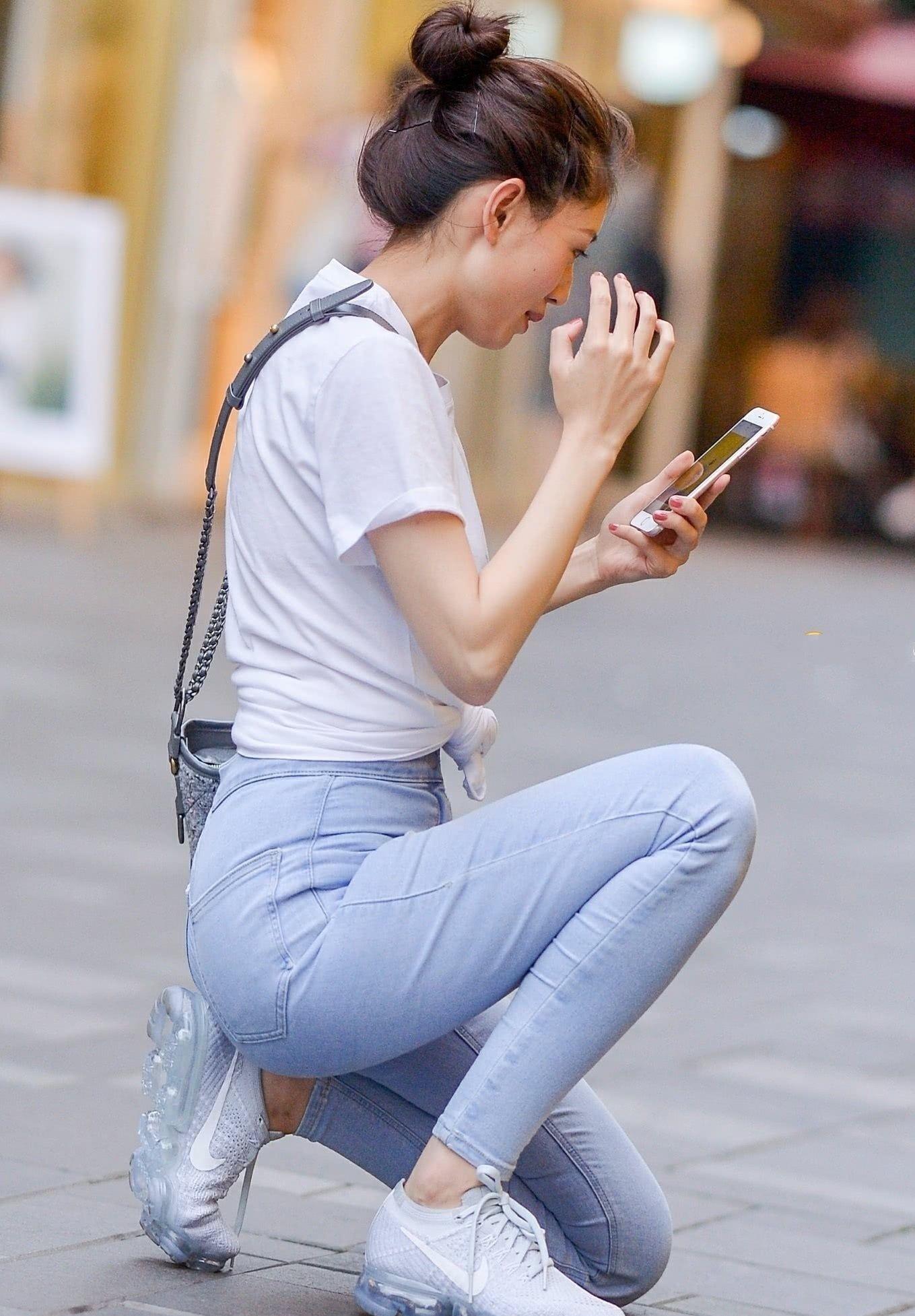 街拍:美女搭配虽然简单,但是难掩盖她的苗条身材!突出极品美臀