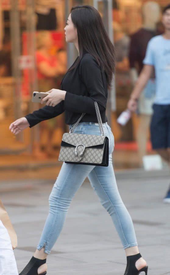 黑色高跟鞋搭配紧身牛仔裤,不管正面还是背影都是那么迷人!